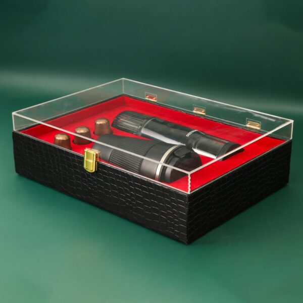پک اسپریتو در جعبه‌ای لوکس با درب پلکسی و چیدمان دقیق اقلام ارائه می‌شود. ظاهر رسمی و مدرن آن برای هدیه‌های مدیریتی یا سازمانی بسیار مناسب است و حس کیفیت و اصالت را در نگاه اول منتقل می‌کند.