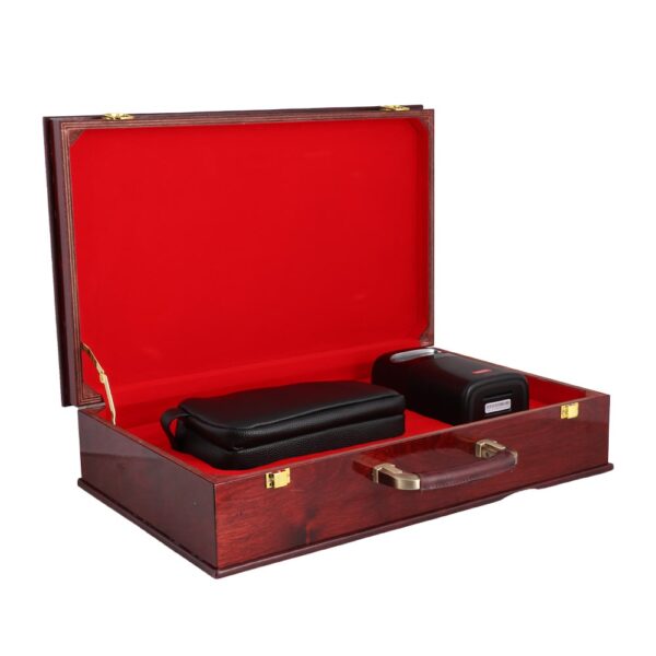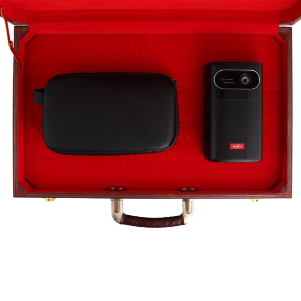 تمامی اقلام در یک جعبه نفیس و  لوکس با روکش چرمی و تکنیک‌های برندینگ شکیل (مانند حکاکی لیزری لوگو روی پروژکتور و داغکوب روی چرم) بسته‌بندی می‌شوند تا حس یک محصول تکنولوژیک و لوکس را به طور همزمان القا کنند.