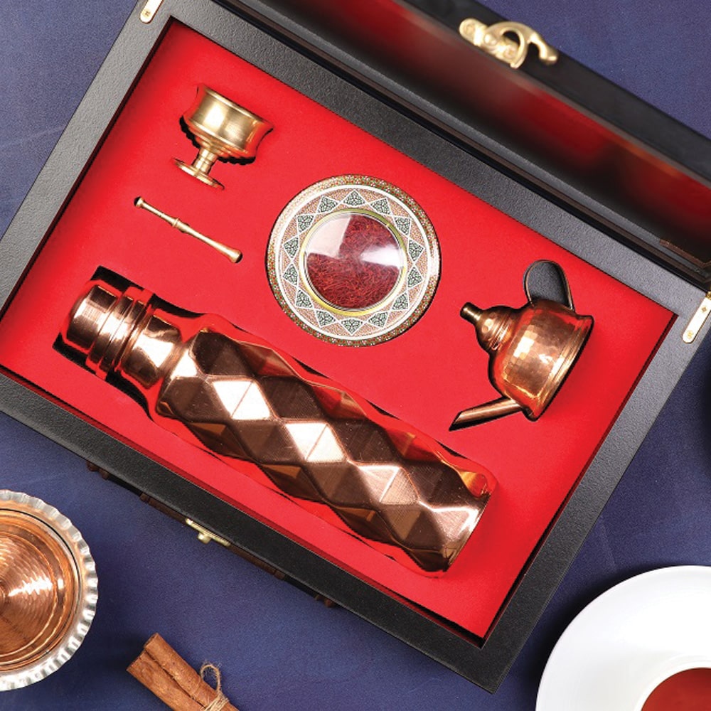 زعفران ایرانی، فلاسک استیل با طراحی مدرن، قوری مسی دست‌ساز و هونگ مسی سنتی، چهار جزئی که در کنار هم، هدیه‌ای کامل و ماندگار را می‌سازند.