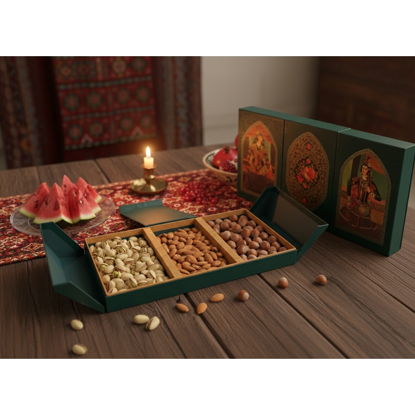 پک هدیه یلدایی سه لتی خاتون با طراحی خاص و جعبهی سهلتی چوبی خود، یکی از ظریفترین و دلنشینترین انتخابها برای هدیه در شب یلداست. این پک بهصورت کاملاً مجزا از سه بخش تشکیل شده و در هر لت آن نوعی آجیل یلدایی تازه و مرغوب قرار گرفته است. ترکیب رنگ گرم آجیلها با بافت طبیعی چوب، حس اصالت و زیبایی را در نگاه اول منتقل میکند.