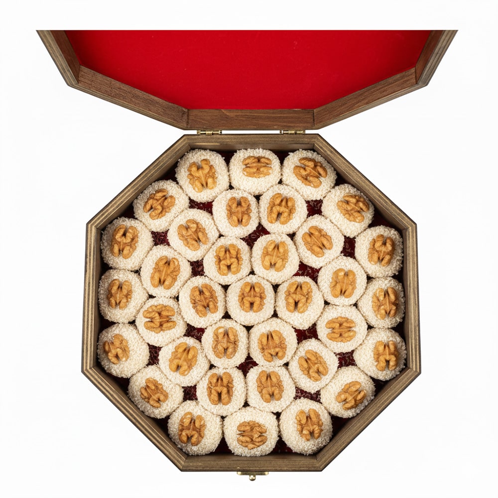 باسلوق‌های خوش‌طعم درون جعبه‌ای هشت‌ضلعی از چوب با روکشی از مخمل قرمز چیده شده‌اند؛ جعبه‌ای که خود، به‌تنهایی یک اثر هنری محسوب می‌شود. طراحی شکیل و بازتاب رنگ قرمز داخل جعبه، حال و هوای جشن یلدا را تداعی می‌کند و این هدیه را به انتخابی لوکس و چشم‌نواز برای مدیران، مشتریان خاص یا عزیزان دل تبدیل می‌سازد.